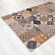 Eleganter Teppich im Patchwork-Design. Er ist in natĂŒrlichen Farbtönen gehalten, die mit Patchwork-Stichen eingerahmt sind. Der Teppich ist mit weichem NĂ€hmaterial glatt gewebt. Dadurch erzeugt nicht nur ein wohliges GefĂŒhl fĂŒr Ihre FĂŒĂe, sonder er ist auch einfach zu reinigen.
