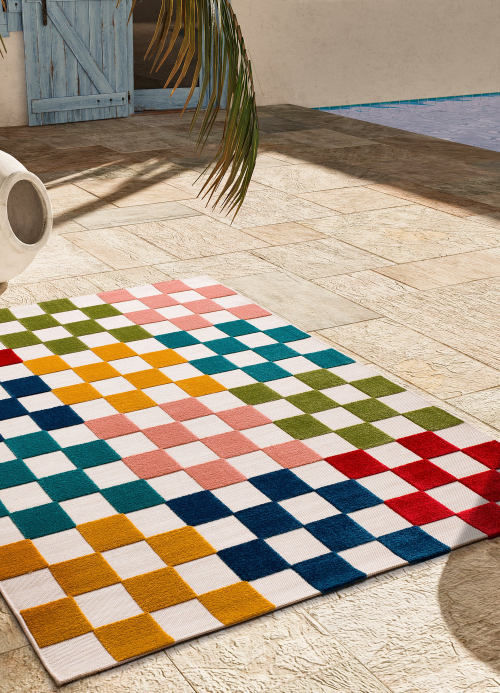 Als Indoor/Outdoor-Teppich eignet er sich sowohl fĂŒr den AuĂenbereich auf Terrasse oder Balkon als auch fĂŒr den Innenbereich.