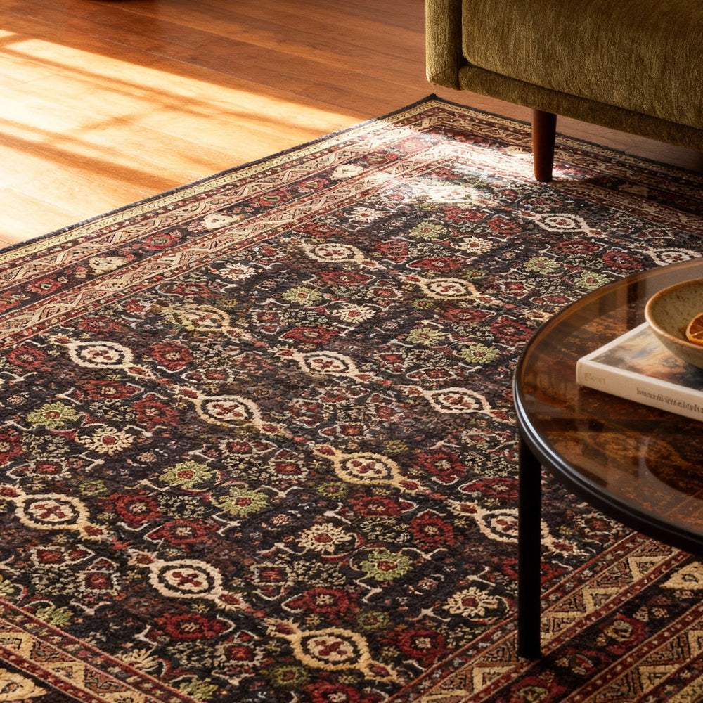 Teppich mit klassischem Orientmuster, dessen FarbstĂ€rke je nach Lichteinfall verschieden ausfallen kann, was ihm ein lebendiges Aussehen verleiht. Dank der fĂŒr seine Herstellung verwendeten seidenĂ€hnlichen Polyester weist er einen tollen Glanz auf und ist wunderbar weich.