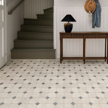 Verkaufspreis âŹ39,95 Normaler Preis âŹ43,95Grundpreis /Nicht verfĂŒgbarHochwertiger PVC-Boden mit einem schönen geometrischen Muster. 300 cm breit.
